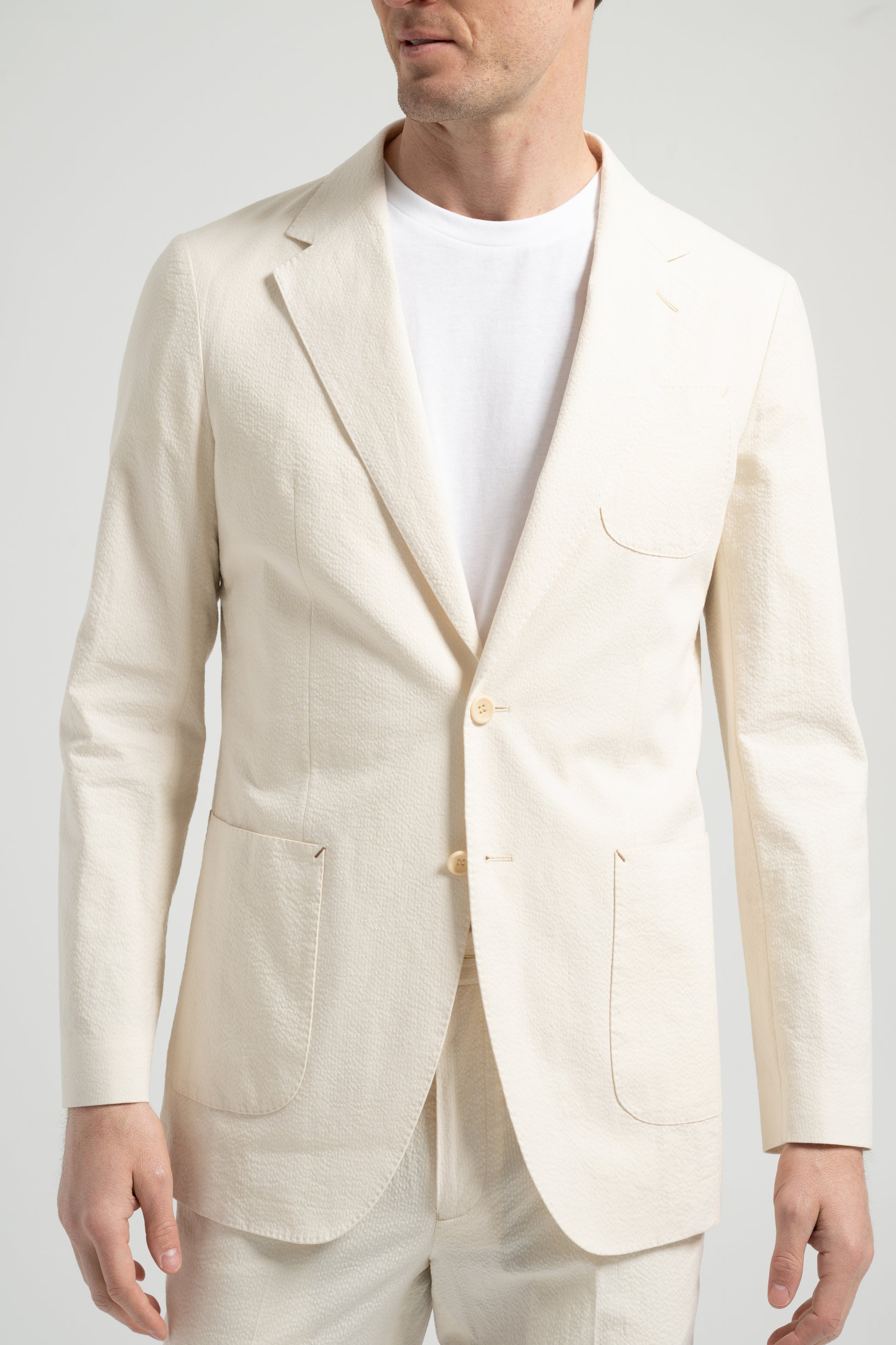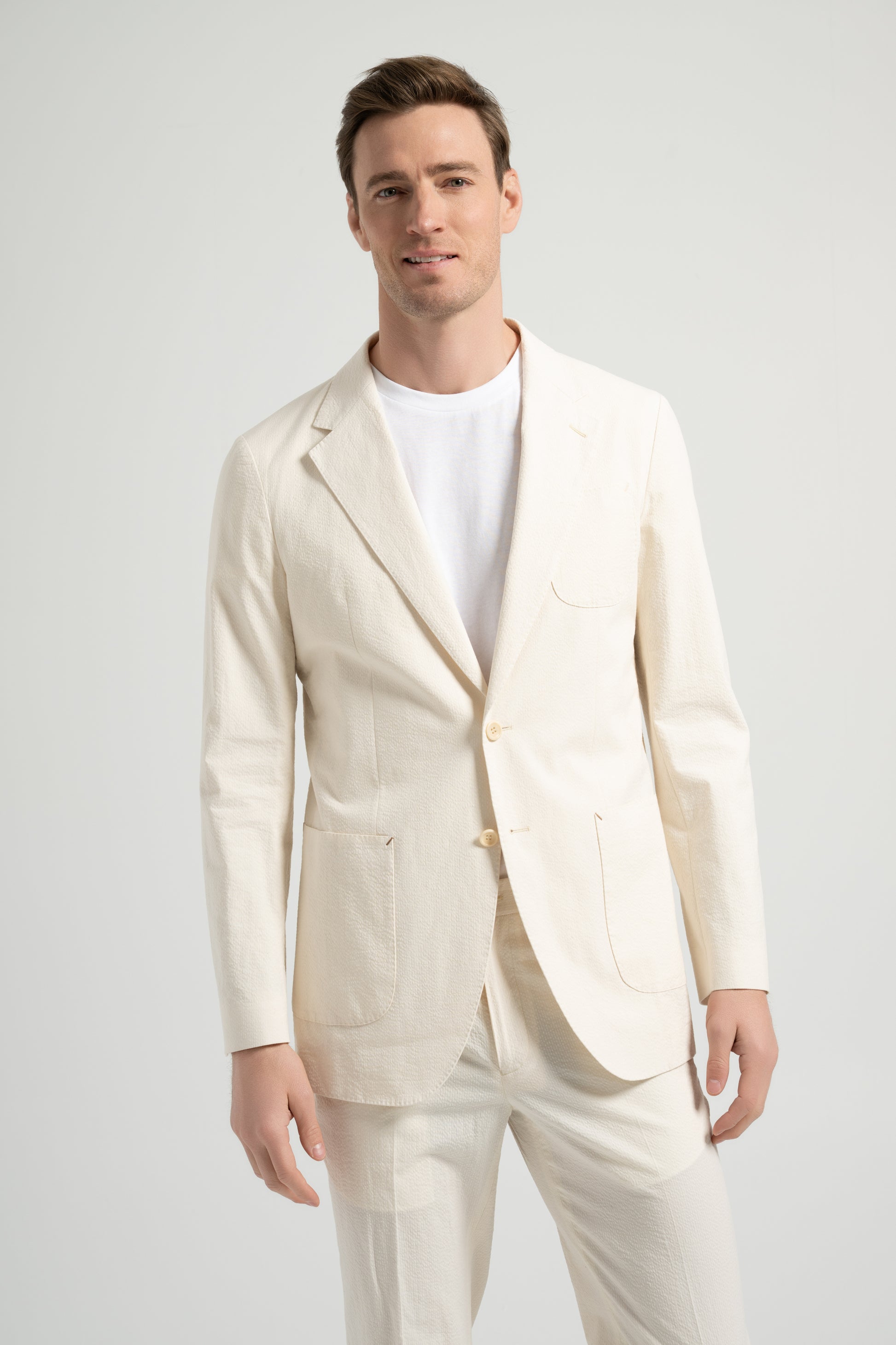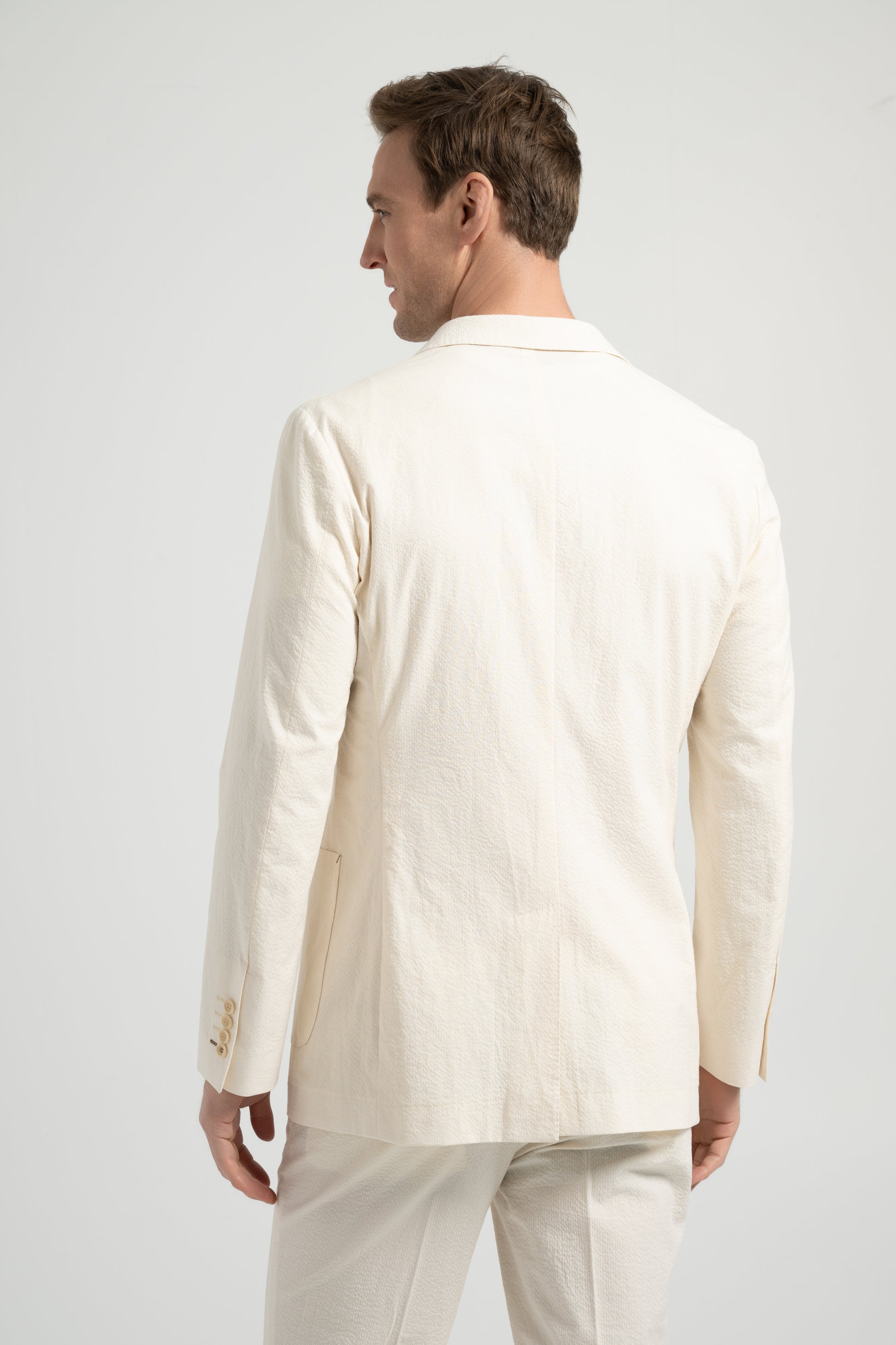 This beige cotton seersucker suit embodies effortless elegance with a casual touch. Designed with a BC casual shoulder, the sleeve head is enlarged, creating a natural and rounded shoulder line without padding for a relaxed fit. The textured seersucker fabric enhances breathability and comfort, making it an essential piece for the spring and summer seasons. A refined yet versatile suit perfect for warm-weather styling.