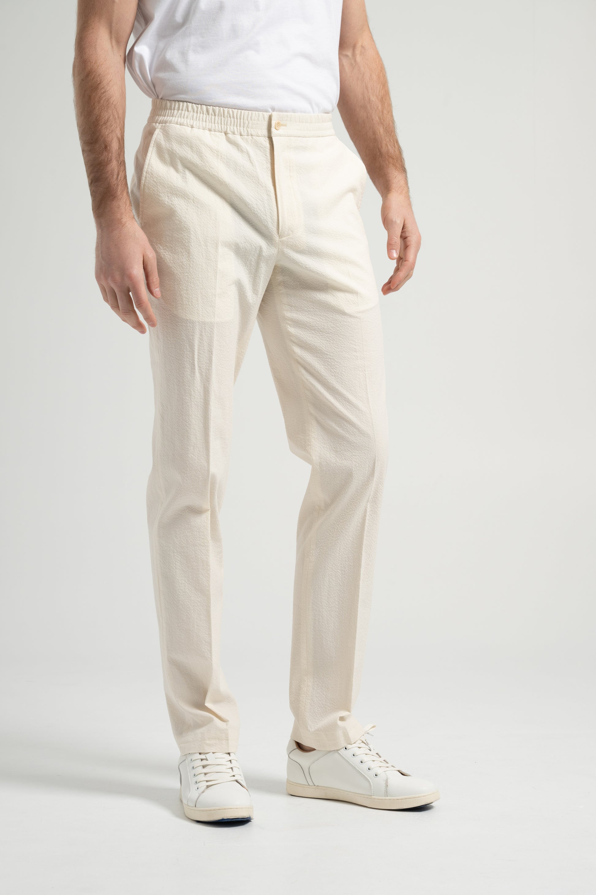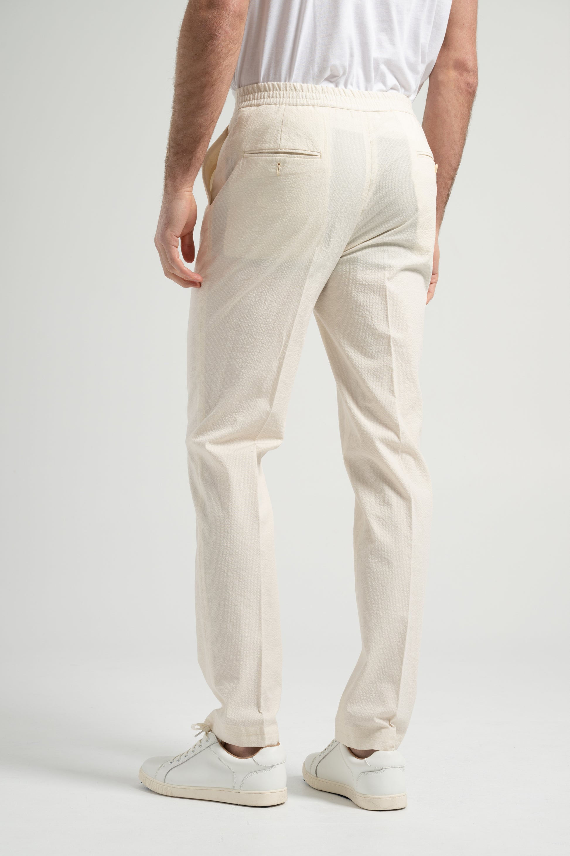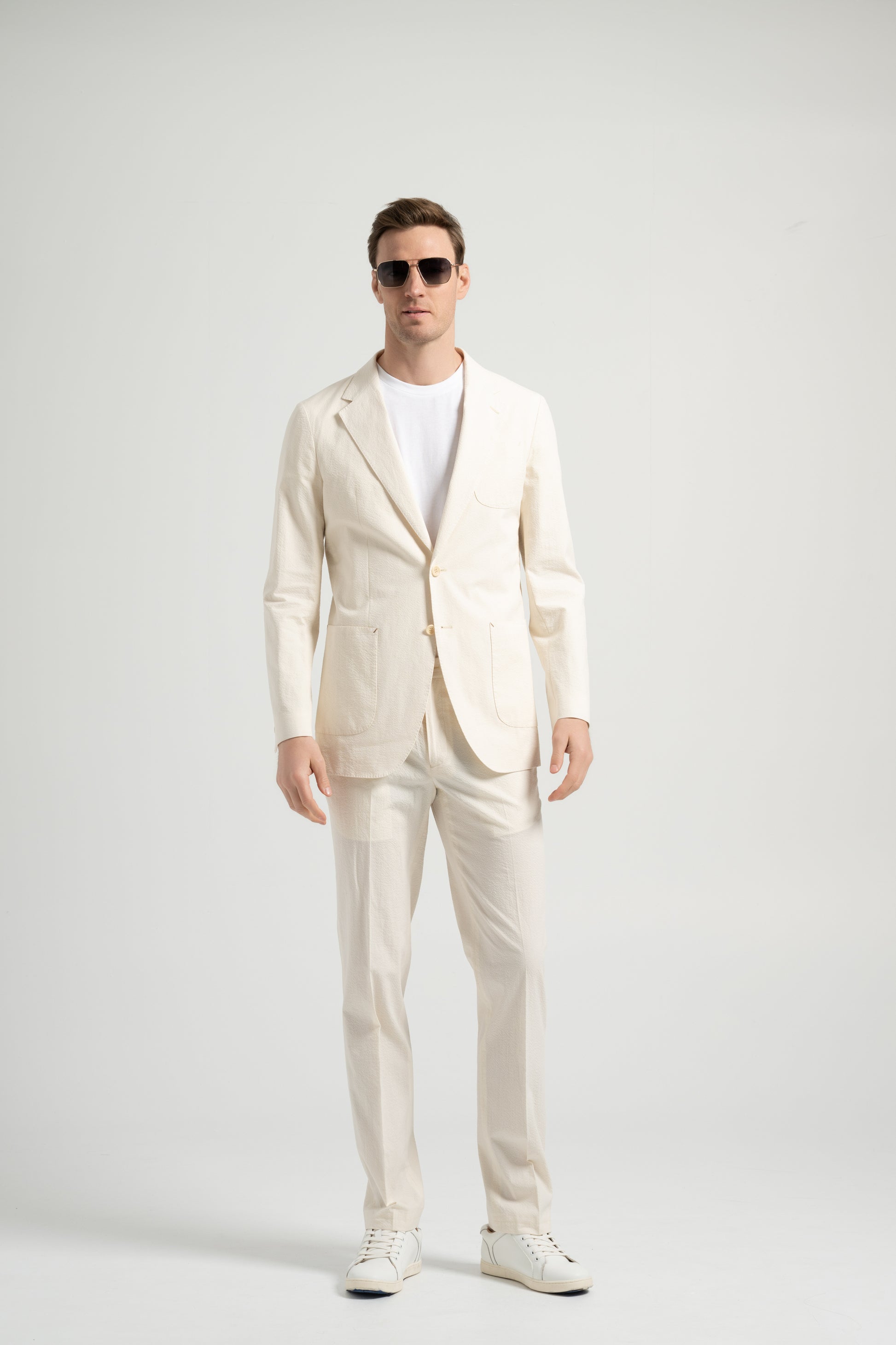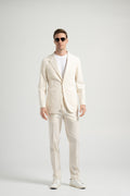 This beige cotton seersucker suit embodies effortless elegance with a casual touch. Designed with a BC casual shoulder, the sleeve head is enlarged, creating a natural and rounded shoulder line without padding for a relaxed fit. The textured seersucker fabric enhances breathability and comfort, making it an essential piece for the spring and summer seasons. A refined yet versatile suit perfect for warm-weather styling.