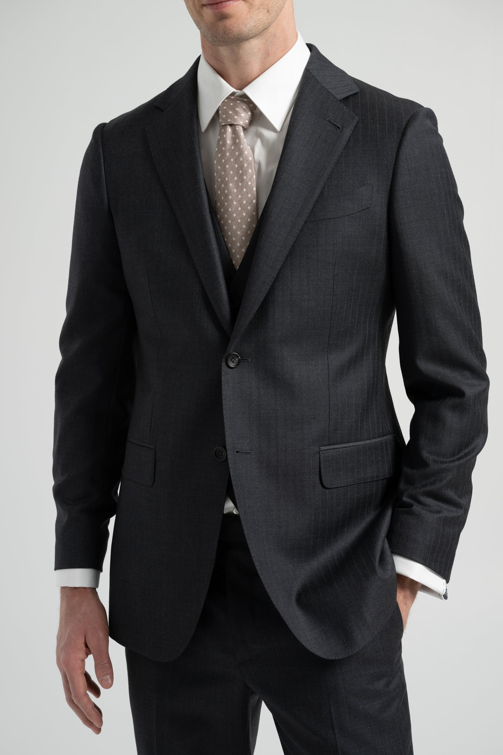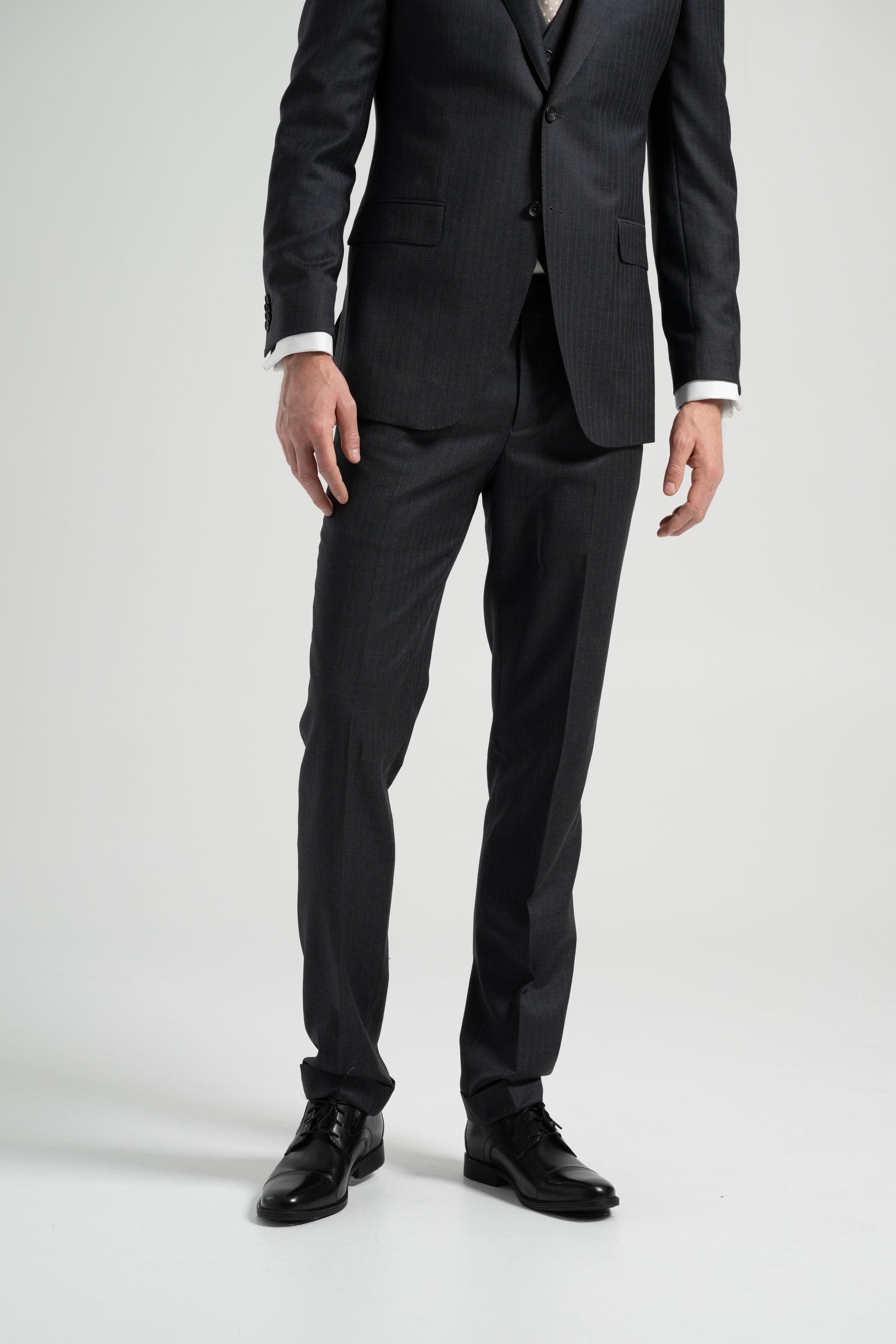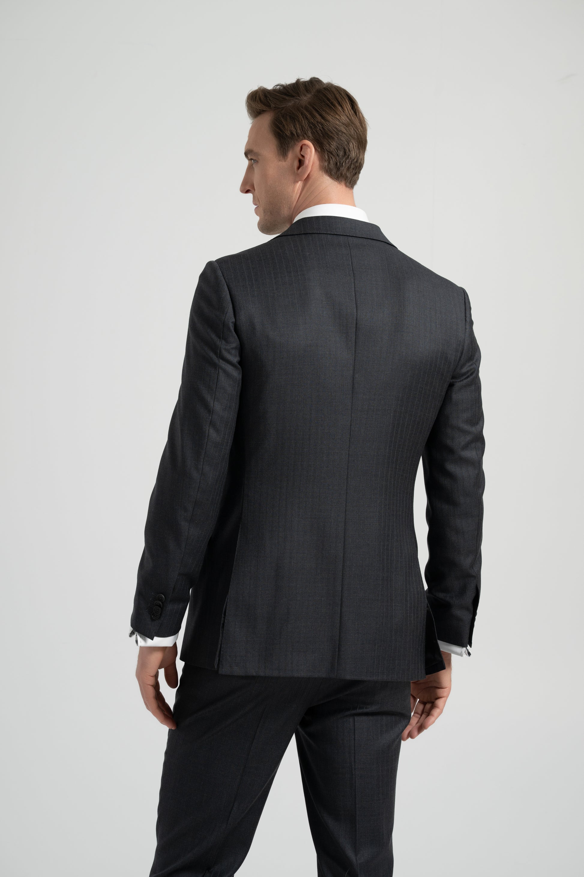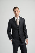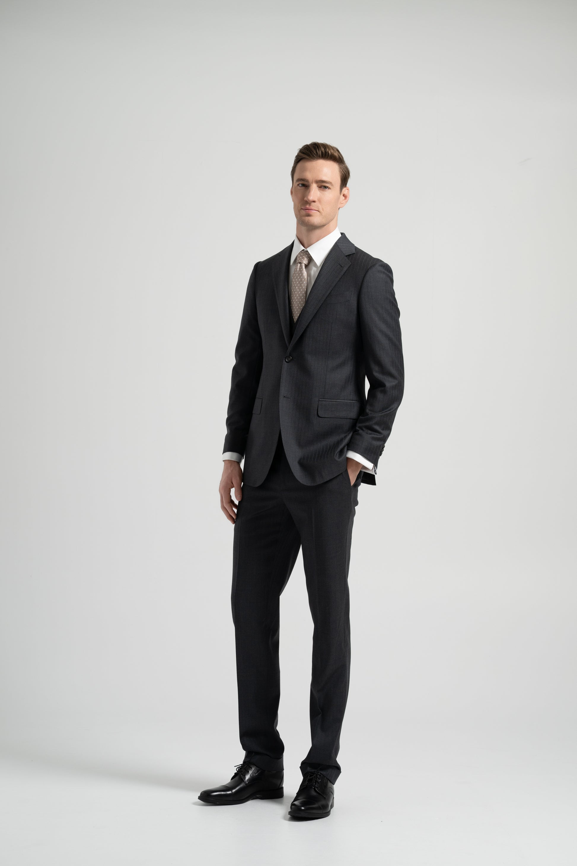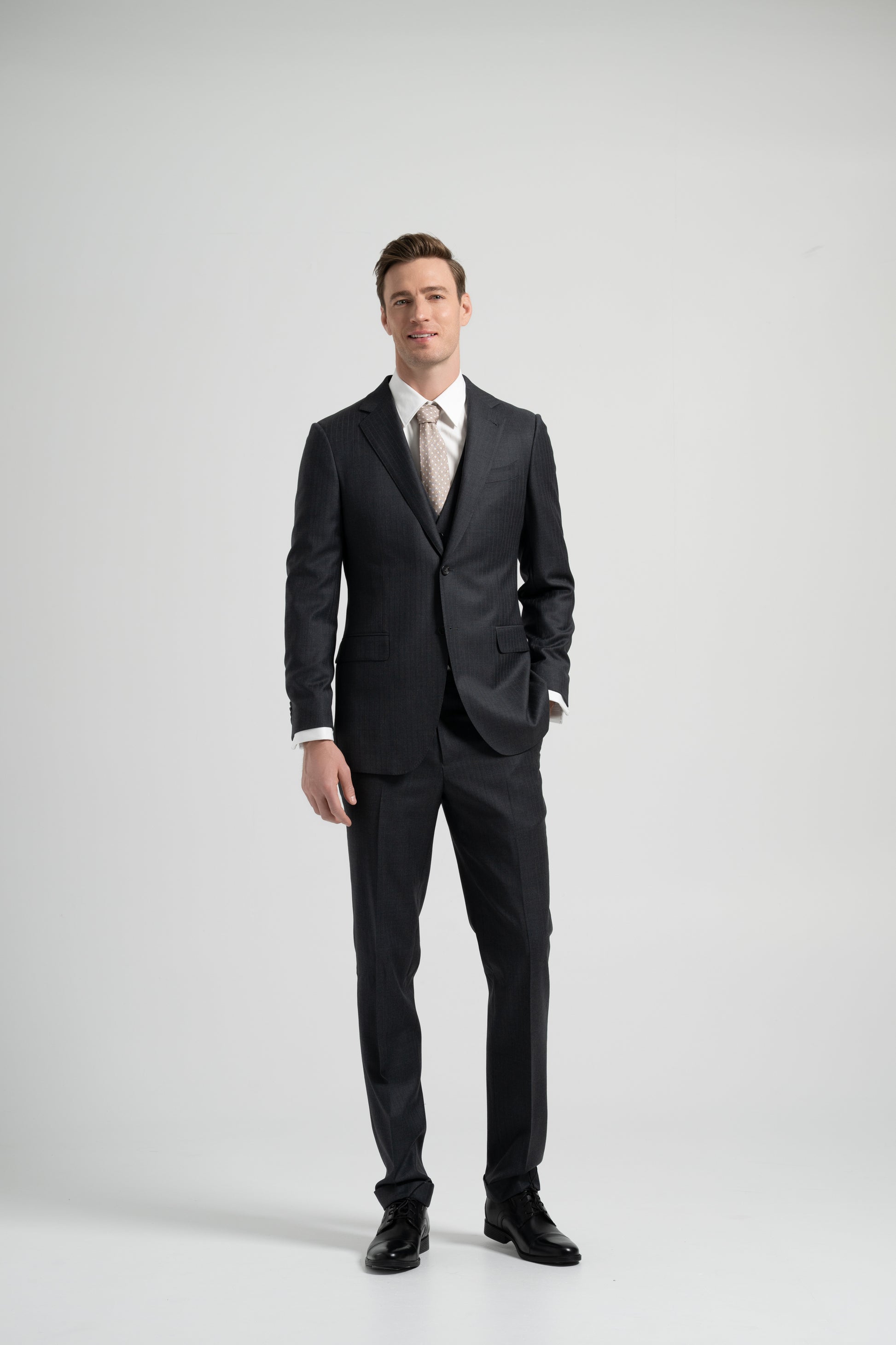 This three-piece wool suit is a perfect balance of elegance and modern refinement, making it an essential addition to a gentleman’s wardrobe.