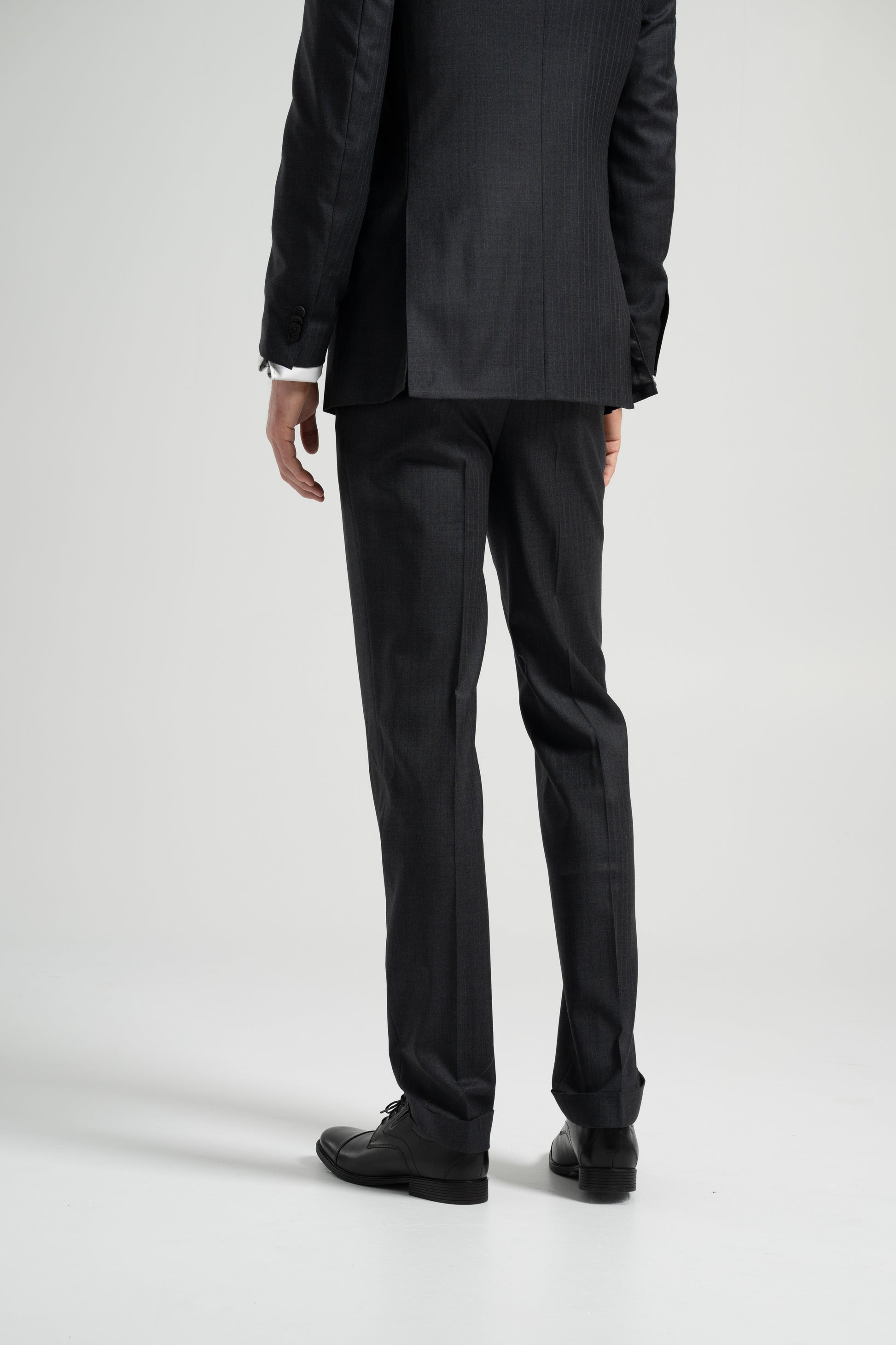 Trousers: Flat-front suit trousers with a straight-leg cut, designed for a clean and polished appearance. The single welt back pockets highlight sophisticated craftsmanship and attention to detail.