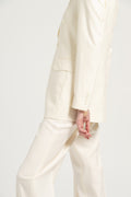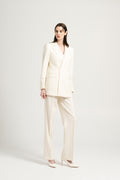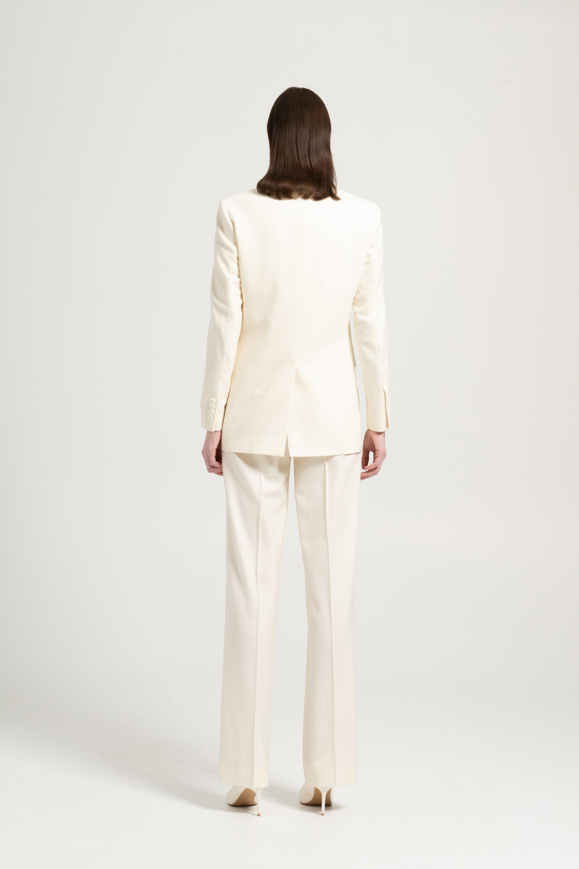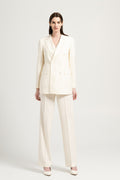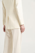 A minimalist double-breasted suit set featuring structured tailoring and a sleek silhouette. The blazer is crafted with peak lapels, flap pockets, and a classic six-button design, while the straight-leg trousers offer a sharp yet comfortable fit. Made from premium Super 140s wool, this suit provides exceptional drape, softness, and breathability for all-day elegance.