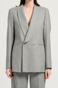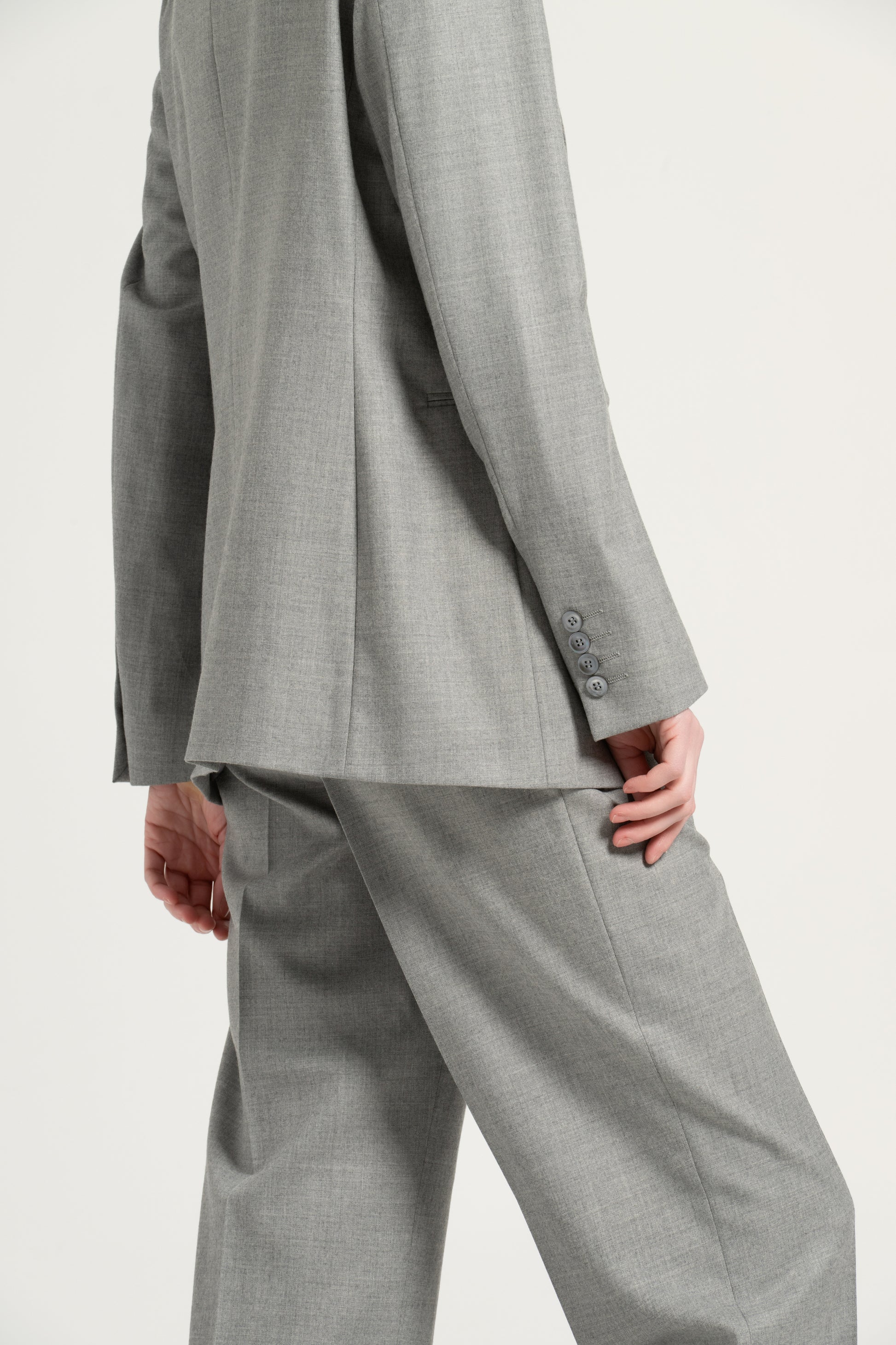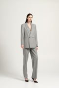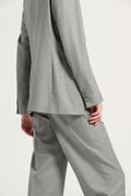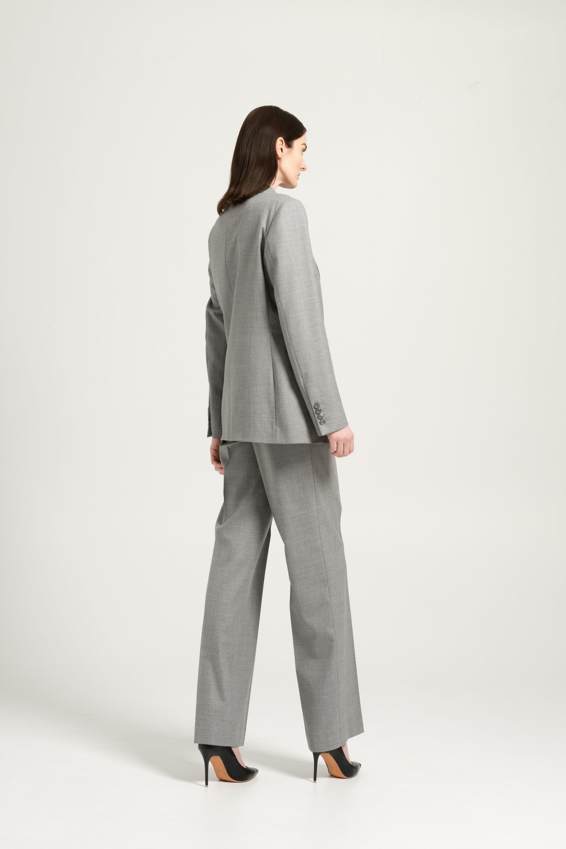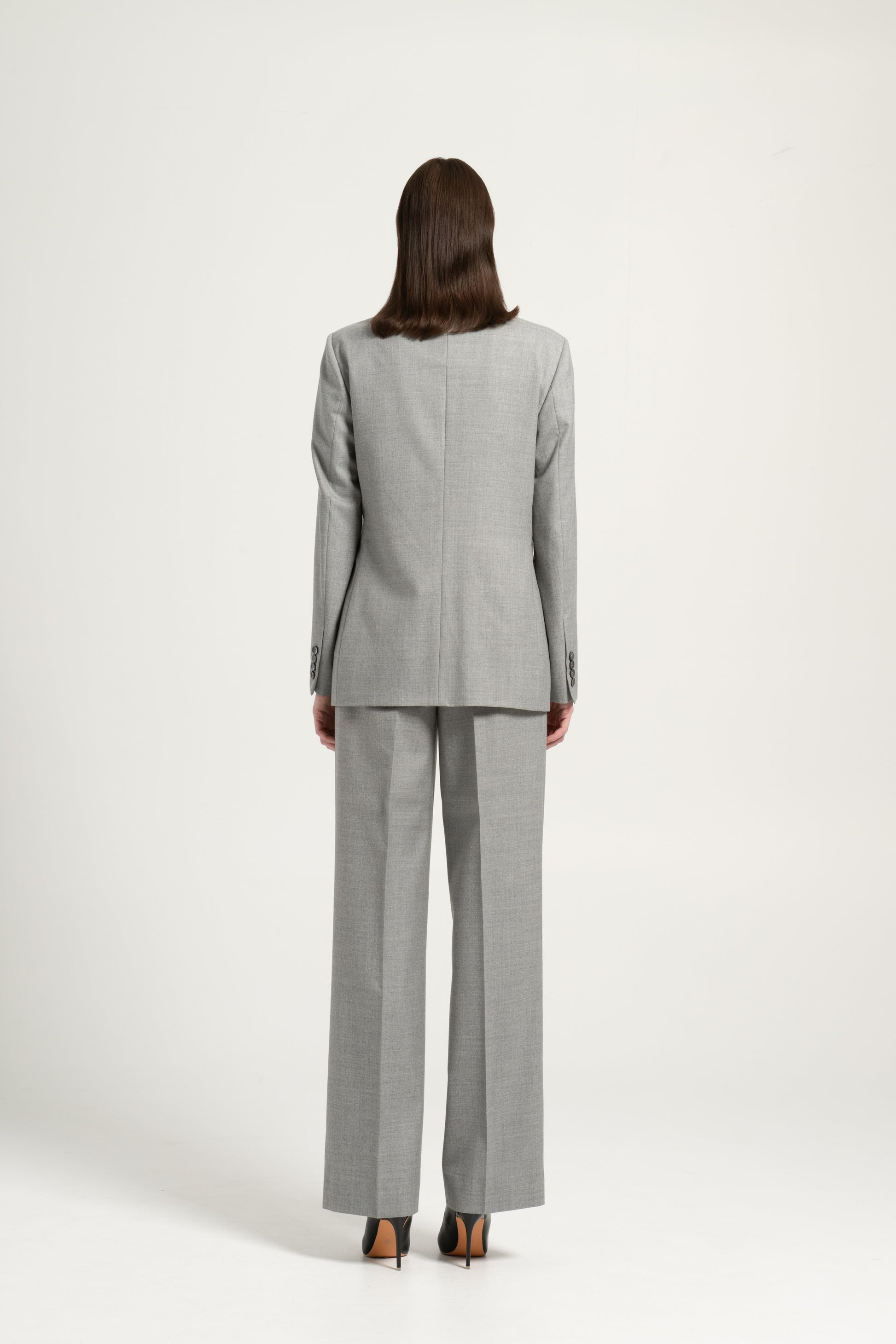 This modern H-line suit set features a straight-cut blazer and wide-leg trousers, emphasizing sharp structure and professional appeal. The blazer is designed with a straight-shoulder, boxy silhouette, forming a distinct geometric shape. The H-shaped waistline subtly redefines traditional tailoring, blurring gender distinctions while reinforcing a strong and confident professional image. The trousers are loose-fitting with a wide-leg, single-pleat design, enhancing fluidity and drape for a refined yet comfortable look.