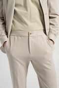 Designed for both comfort and versatility, these drawstring trousers feature a textured fabric that offers breathability and a refined look. The elasticized waistband with an adjustable drawstring ensures a secure yet flexible fit, making them perfect for both casual and semi-formal occasions.